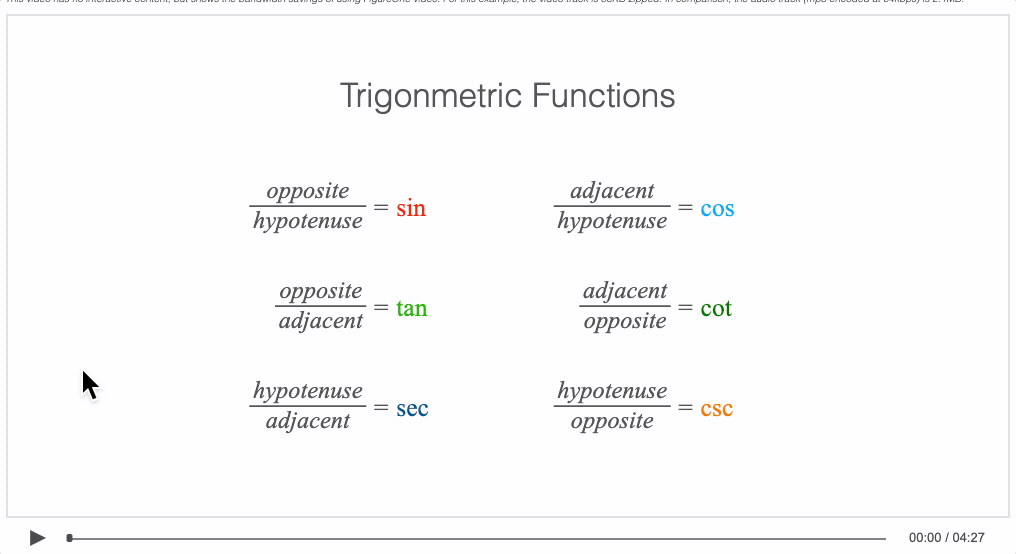 Note: for the video-like experiences, FigureOne creates a custom vector video format which is interactive, resolution independent, and a fraction of the size of an normal audio track. This results in very low bandwidth video. For example, 4 minutes of animated content might result in a video track 70KB in size. See below for some examples of interactive videos. More information on this, and the trade-offs with traditional video can be found in the API Reference.