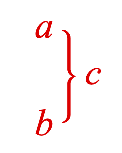 figure.add({ make: 'equation', elements: { brace: { symbol: 'brace', side: 'right', width: 0.05 }, }, forms: { form1: { annotate: { content: 'c', glyphs: { left: { symbol: 'brace', space: 0.05, overhang: 0.2, annotations: [ { content: 'a', xPosition: 'left', yPosition: 'top', xAlign: 'right', yAlign: 'middle', offset: [-0.05, 0], }, { content: 'b', xPosition: 'left', yPosition: 'bottom', xAlign: 'right', yAlign: 'middle', offset: [-0.05, 0], }, ], }, }, }, }, },});@interface Copy