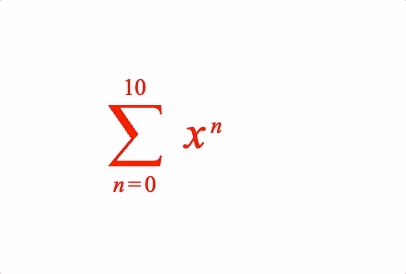 // Example showing different optionsfigure.add({ name: 'eqn', make: 'equation', elements: { s: { symbol: 'sum', draw: 'dynamic' }, inf: '\u221e', }, forms: { // Object form 1: { sumOf: { symbol: 's', content: [{ sup: ['x', 'n'] }], from: ['n_1', ' ', '=', ' ', '_0'], to: '_10', }, }, // Array form 2: { sumOf: ['s', [{ sup: ['x', 'm'] }], 'm_1', null]}, // Styling with options 3: { sumOf: { symbol: 's', content: { frac: [['x', ' ', '+', ' ', 'm'], 'vinculum', 'a'] }, from: ['m_1', ' ', '=', ' ', '_0'], to: 'inf', fromScale: 0.8, toScale: 0.8, }, }, }, formSeries: ['1', '2', '3'],});const eqn = figure.elements._eqn;eqn.onClick = () => eqn.nextForm();eqn.setTouchable();eqn.showForm('1');@interface Copy